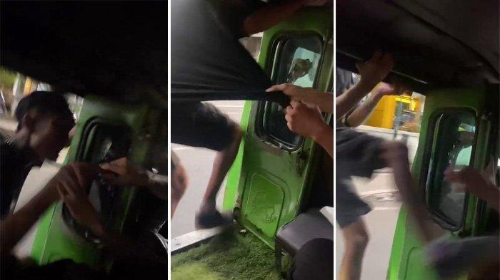 Dalam video yang beredar, terlihat seorang pemuda memakai baju berwarna hitam menaiki angkot di pintu mobil melakukan intimidasi terhadap penumpang yang duduk di bagian depan angkot.