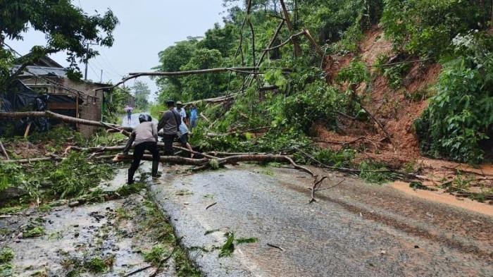 Material tanah, batu, dan pohon tumbang menutup jalan sehingga arus transportasi dari Kota Agung Timur menuju Limau lumpuh total.