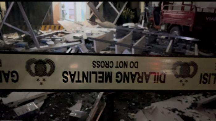 Garis polisi dipasang di dua bangunan terdampak, dan warga diminta menjauh dari lokasi.