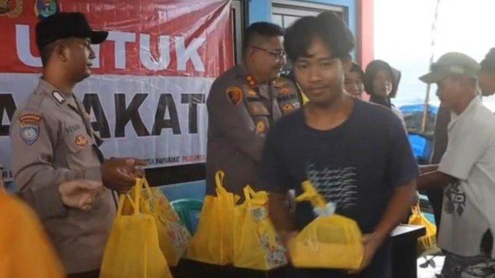 Polair Polres Lampung Selatan membagikan sembako dan menyosialisasikan Call Center 110, Mudik Aman Keluarga Nyaman di Dusun Keramat