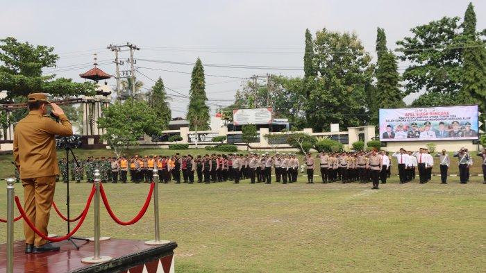 Personel gabungan Polres Lampung Utara bersama TNI, Brimob dan pemkab setempat apel siaga bencana di halaman mapolres, Selasa (10/12/2024).