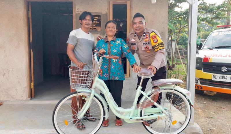 Anggota Bhabinkamtibmas di Polres Lampung Tengah Aipda Leonardo memberikan satu unit sepeda gratis untuk warga kurang mampu.