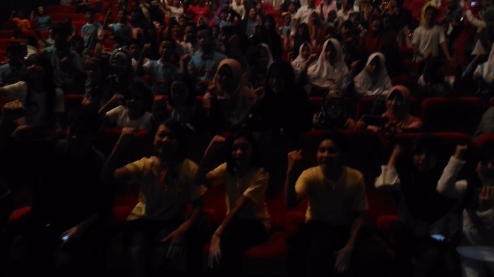 Suasana nonton bareng film Naura and Genk Juara bersama istri Gubernur Lampung, Yustin Ridho Fichardo dan artis cilik Naura, meriah